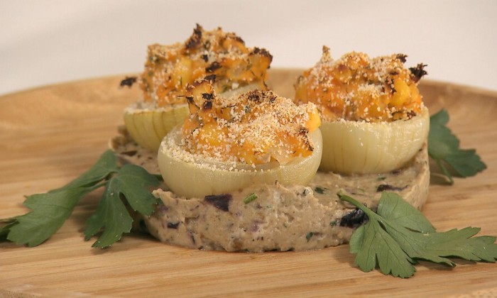 Gevulde aubergine uit de oven, geserveerd met quinoasalade met tomaatjes, sojabonen en geroosterde cashewnoten. Klinkt toch hemels?