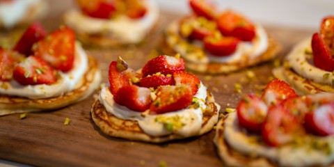 Doe een eetlepel van deze crème op een afgekoelde pancake en verspreid het er overheen. Decoreer met aardbeien en pistache.