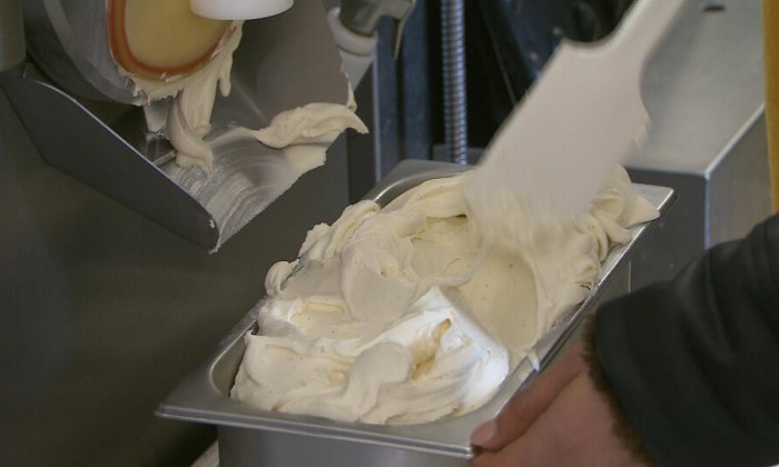 Haal op tijd het slagroomijs uit de vriezer zodat deze ietwat zachter is geworden. Meng dan in delen de appelstroop door het ijs en koel terug.