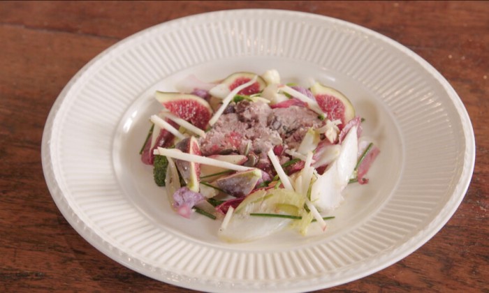 Doe alles in een kom en voeg een lepel vijgenjam toe. Vervolgens voeg je de schil van een halve citroen toe en een lepel abrikozenjam. Meng alles goed door elkaar en voeg wat peper en zout toe.