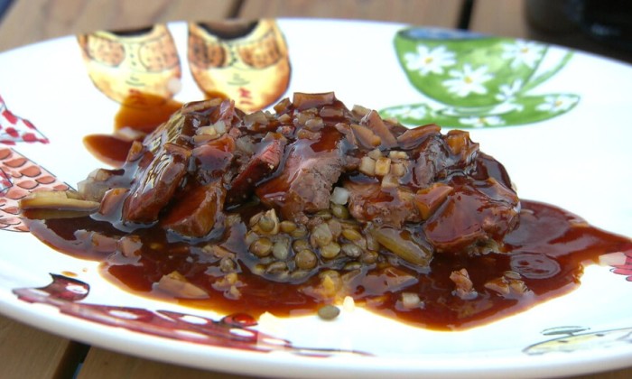 Gaar vervolgens de eend af in een op 160 graden voorverwarmde oven gedurende 10 minuten.