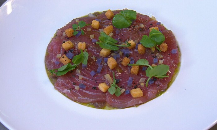 Chef-kok Alain Caron maakt een heerlijke carpaccio van ossenhaas. En het is eigenlijk heel simpel. Met burrata, Parmezaanse kaas, wintertruffel, Franse mesclun sla, ansjovis en citroen. Heel smaakvol!