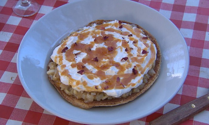 Een verrukkelijk taartje, laag in suikers en bovendien een plaatje om te zien! Pure chocolade, vers seizoensfruit, blanke amandelen, ahornsiroop, zoete rode bietjes voor de kleur en frisse geraspte sinaasappel en kokos.