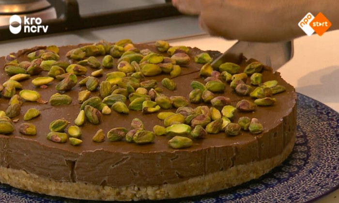 Maak een spijs door 250 g blanke amandelen fijn te malen met 75 g wit sesamzaad en een flinke schep witte tahina. Breng op smaak met kokosbloesemsuiker en wat oranjebloesemwater. Meng voor de kleur van roze spijs wat bietenpoeder er doorheen. Vorm er een ronde gelijkmatige plak van (zelfde afmeting als de cake).