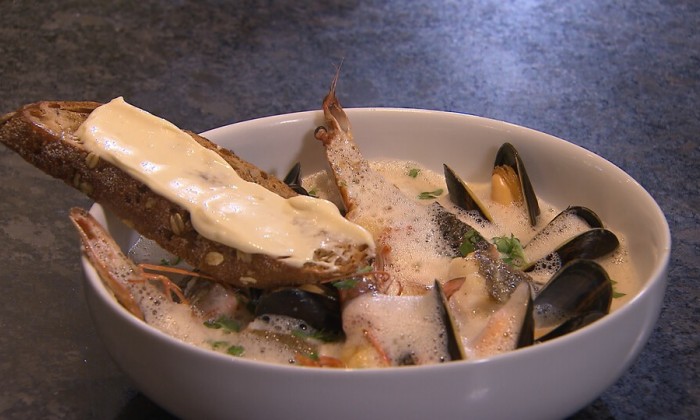 Nu maken we de garnalencocktail. Maak een sausje met mayonaise, ketchup, wat gehakte Madame Jeanette en een scheutje gin. Meng dan de komkommer en avocado door de saus en voeg de garnalen toe met een snufje zout.