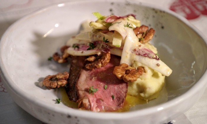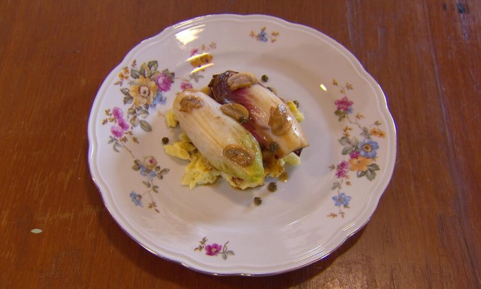Gebakken witlof, kip, Parmezaanse kaas, crosnes en zuurkool