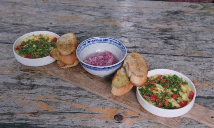 Breng de hangop op smaak met een scheutje gerookte olijfolie, zout en de schil en het sap van een ½ limoen.