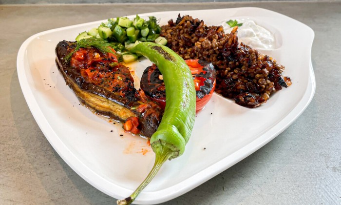 Chef-kok Geneal Harreman maakt een heerlijk kruidig voorgerecht; aubergine met ras el hanout. Geserveerd met gebakken cherrytomaten, olijven en parmezaanse kaas.