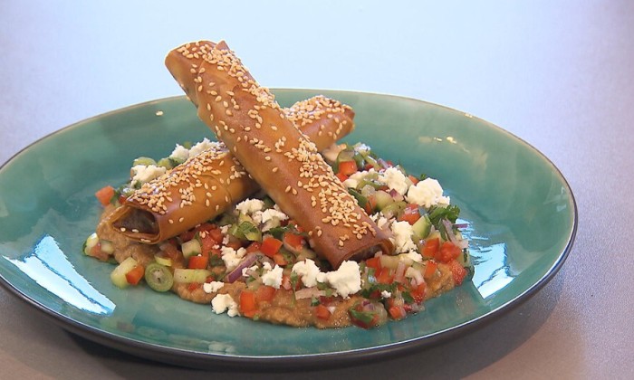 Voor de bodem van filodeeg verwarm je de oven voor op 180 graden. Leg het filodeeg dubbel en leg de uitsteekring op het filodeeg en snijd 2 cm buiten de ring rondom met een scherp mes. Smeer de ring (binnenkant) in met olijfolie en leg het filodeeg voorzichtig in de ring en houd 1 cm over aan de bovenkant. Leg de ring met filodeeg op het bakpapier en plaats in de oven. Bak ze tot ze mooi lichtbruin worden. Pas op, het gaat snel, dus let goed op. Laat daarna afkoelen buiten de oven. Herhaal dit 5 keer (voor als er één kapot gaat).