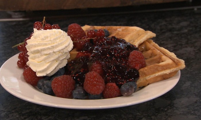 Onze chef Ramon Brugman maakt hartige blini's met een compote van cranberry's uit Ameland. Afgetopt met krokant gebakken spek, brie en frisse tuinkers.