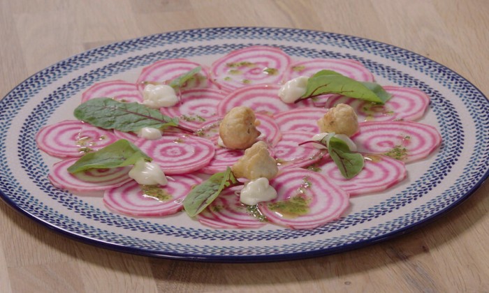 Voor de dressing gebruik je een scheutje bietensap, citroensap, olijfolie, zout en peper. Voeg daaraan een lepeltje truffel tapenade toe en mix het.