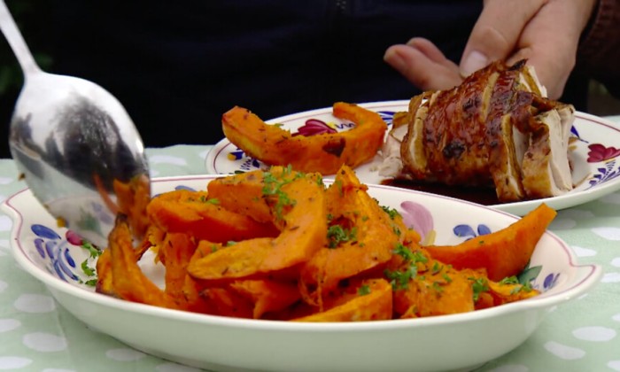 Haal de pompoen die je bij de kalkoen hebt gebruikt van de bakplaat af tijdens het rusten. Snijd het vruchtvlees van de schil en zet apart. Schep de overige groenten van de bakplaat in een zeef en vang het braadvocht op. De groenten heb je niet meer nodig.