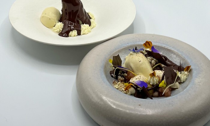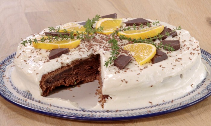 Maak in de tussentijd de sinaasappelcurd. Verwarm hiervoor het sap en schil van de sinaasappel, het sap van de citroen, de boter en suiker totdat de suiker is opgelost. Zet het vuur laag en kluts de eidooiers er kort door. Voeg nu toe aan het hete mengsel, maar let op, dit moet snel gemengd worden met een garde en houd de curd goed in beweging. De eidooiers moeten rustig garen en niet te snel, anders heb je kans op roerei. Zodra je de curd dikker ziet worden, is deze goed. Dit gebeurt rond 80 graden. Schenk de curd vervolgens door een zeef en koel terug in de koelkast.