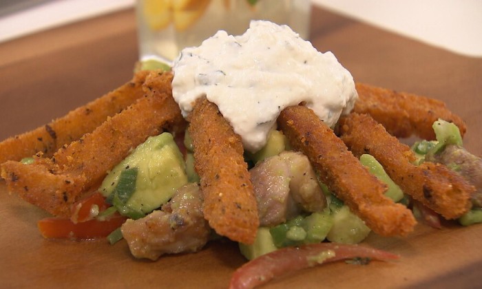 Maak nu de salade. Meng alle ingrediënten behalve de olie door elkaar. Voeg nu druppelsgewijs de olie toe terwijl je blijft roeren.