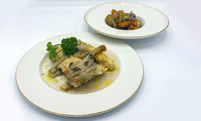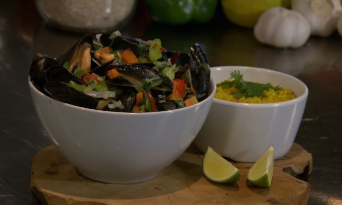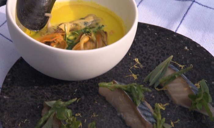 Moules parquées: snijd de rauwe mosselen open door het mes er tussen te wringen en de spier los te snijden. Leg ze op een schaal met crushed ijs en zeewier. Serveer met citroen en peper.