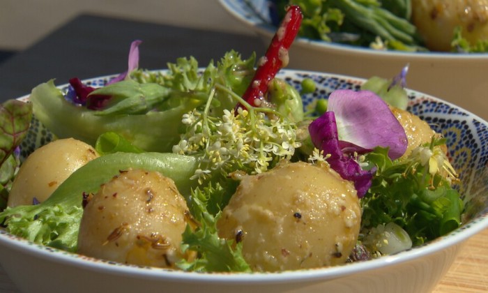 Lente salade met radijsjes, Utrechtse uitjes en knoflookvinaigrette