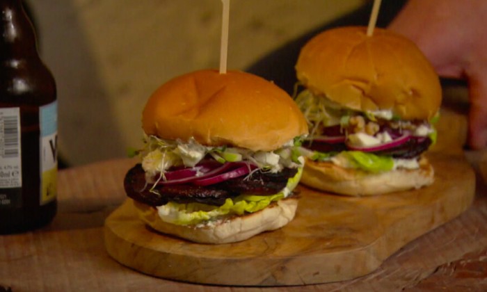 Snijd de rode ui, appel en de rode biet brunoise, in kleine blokjes. Hak de walnoten en roer alles door elkaar.