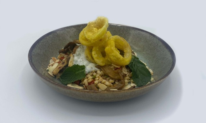 Serveer de salade met wat avocadocrème op het bord. Schep hier de bietensalade op. Werk het geheel af met de geitenkaas en de appelrolletjes. Leg hier nog een paar plakjes tuinkers bovenop.