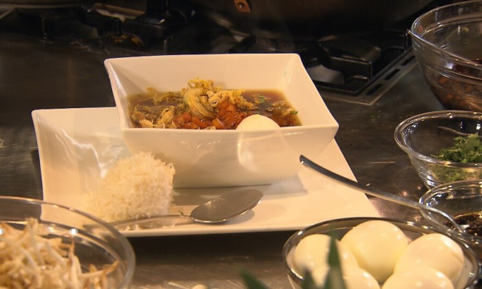 Neem een soepkommetje en plaats hierin wat rijstnoedels. Schenk er een flinke soeplepel bouillon overheen. Daarna maak je de soep af door er eerst de gebakken paksoi, de gebakken shiitake en een paar blokjes tofu in te doen. Tot slot een half eitje, wat lente-ui en de koriander. En klaar is je soep!