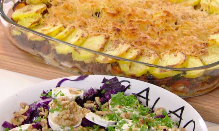 Vet een ruime ovenschaal in en doe het mengsel in de ovenschaal. Verspreid de geraspte mozzarella erop en bak de ovenschotel in 20 minuten af.