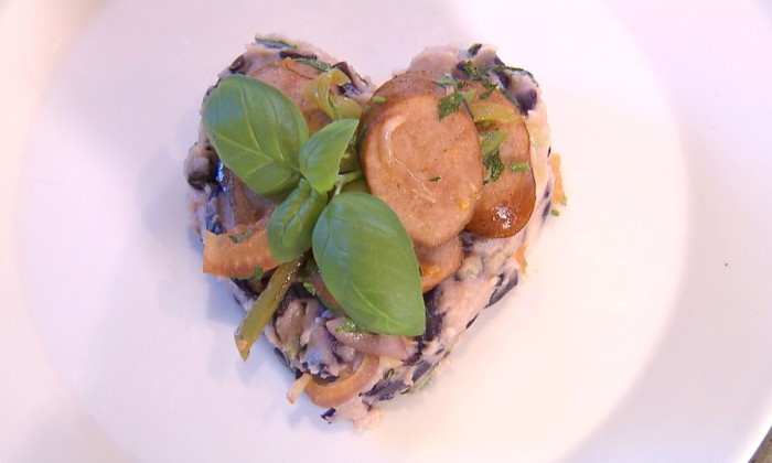 Onze chef-kok Sharon maakt een stamppot met pastinaak, spinazie, aardappelen, blokjes witte kaas en Gelderse rookworst.
