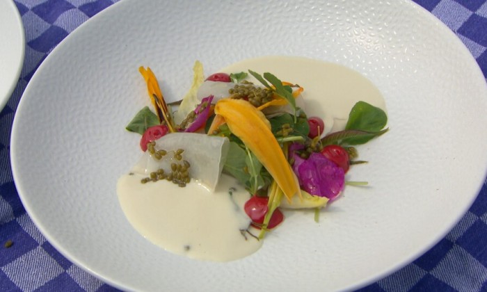 Onze chef-kok Ramon Brugman maakt polpette di melanzane; Italiaanse balletjes van aubergine uit de moestuin van BinnensteBuiten. Een échte smaakexplosie door de zoetzure uitjes, ricotta, verse basilicum en rucola bloemetjes, natuurlijk geplukt door onze duurzame tuinvrouw Anne Wieggers.