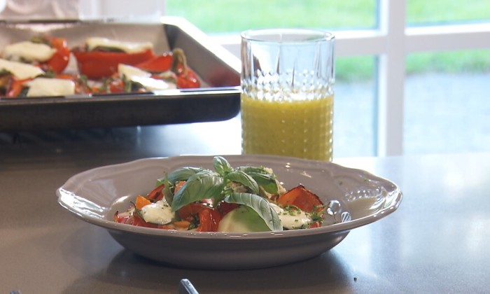 Pompoenstamppot met geroosterde groente en pittige pesto