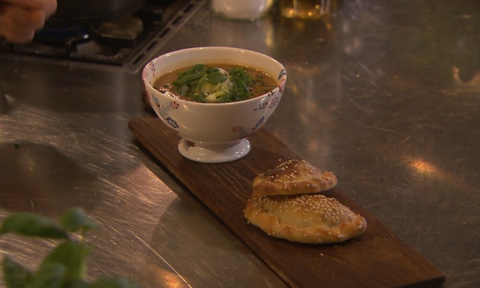 Preisoep met soepstengels, provolone en chimichurri