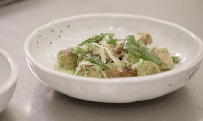 Ga verder met de pesto. Pluk de bladeren van de watermunt, zevenblad, duizendblad en kamille en snijd ze fijn. De stelen mogen bij de bouillon. Doe de gesneden wildpluk in een kom.