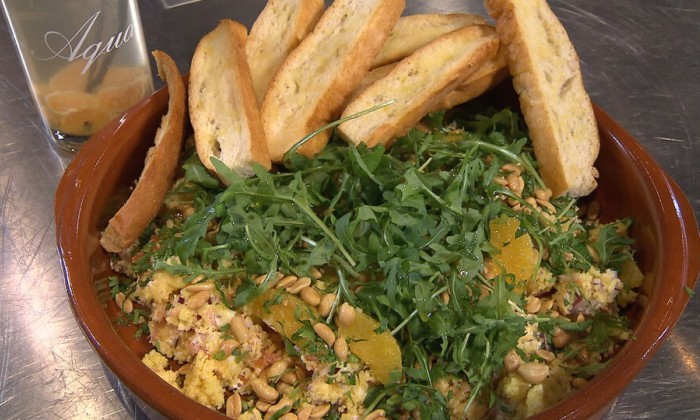 Meng de gesneden abrikozen, rode ui, bieslook en peterselie door de gegaarde couscous. Breng de couscoussalade op smaak met zout en peper.