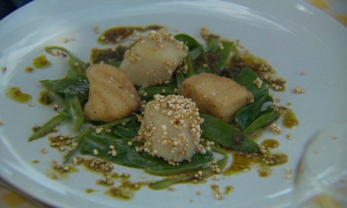 Onze culinair expert Alain Caron gaat aan de slag met spirulina. Hij gebruikt deze voedzame algen bij het maken van Sint Jacobsschelpen met aardappelen.