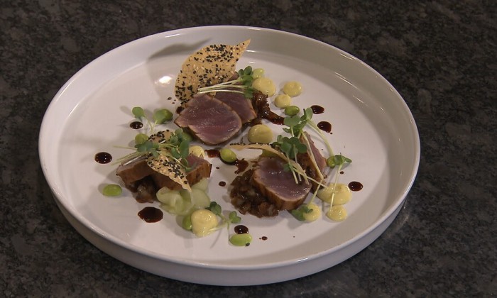 Terwijl de pompoen in de oven zit, ga je verder met het maken van de tonijnsalade. Laat de tonijn goed uitlekken. Snipper het uitje, hak de peterselie fijn en snij wat Madame Jeanette naar smaak. Meng alle ingrediënten goed door elkaar en breng het op smaak met wat zout.