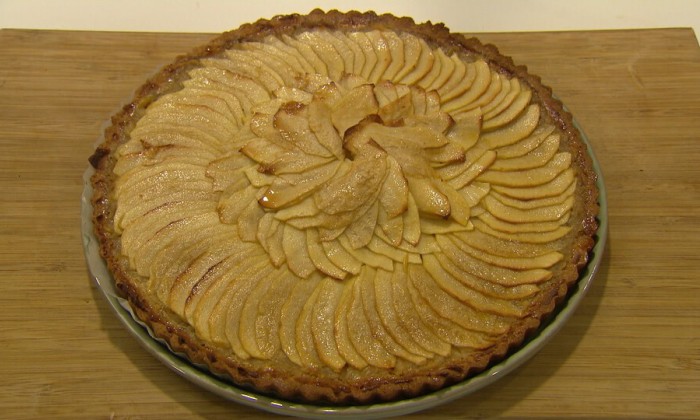 Schil de nashipeer en snijd in hele dunne plakjes. Leg deze plakjes op het bladerdeeg met frangipane.