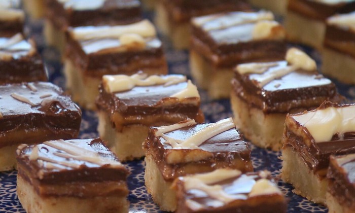 Schraap tenslotte met een mes wat feestelijke krullen van de witte chocolade en leg deze boven op de kletskoppen. Doe daar de verse taybessen bovenop. Je dessert is klaar!