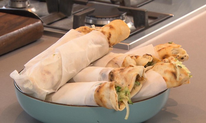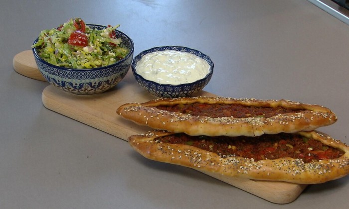 Chef-kok Leon Mazairac gaat aan de slag met lahmacun, dit gerecht staat ook wel bekend als Turkse pizza. Leon serveert de pizza met dunne plakjes tonijn en een Aziatische dressing van soja, furikake, ui en peterselie.