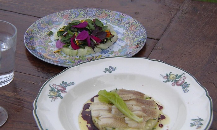 Voor de presentatie maak je een cirkel van de koolraap mousseline. Leg hier de gebakken romanesco bovenop, dan wat rauwe koolraap en in het midden de bitterbal van koolraap en Parmezaanse kaas.