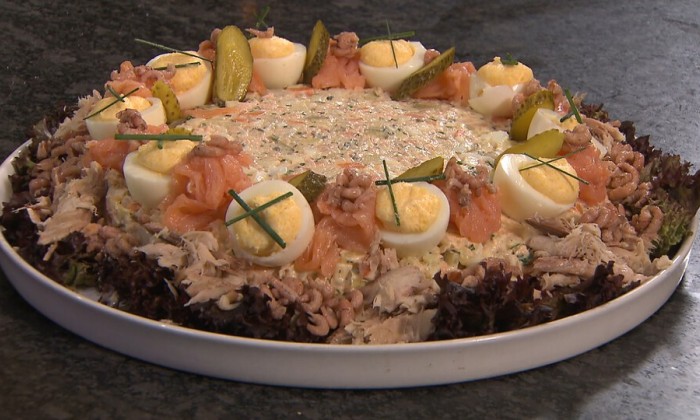 Smeer een flinke laag van de zalmfilet americain op de crackers en beleg ze met de garnituur.
