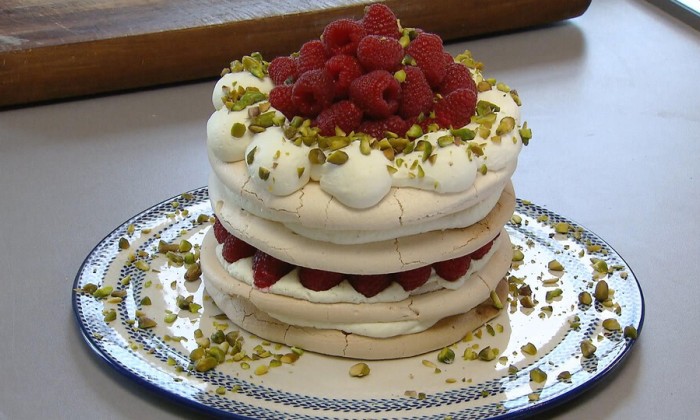 Geef er wat frambozensaus en verse frambozen bij.