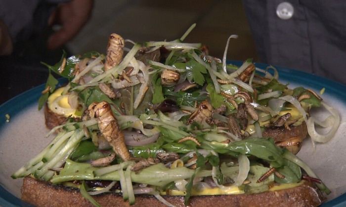 Zoete aardappelnoedels met sprinkhanen