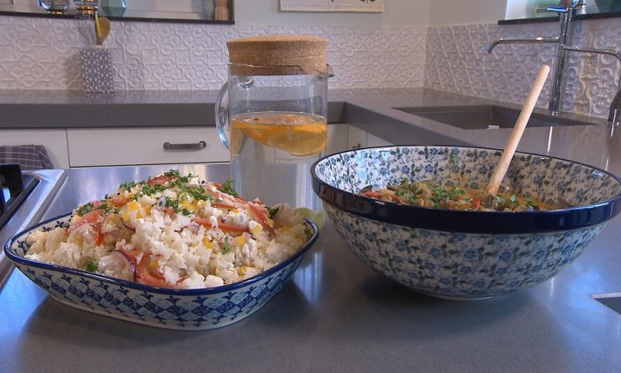 Zoete curry met aubergine, munt-yoghurt dip, kokosrijst en pakora van ui