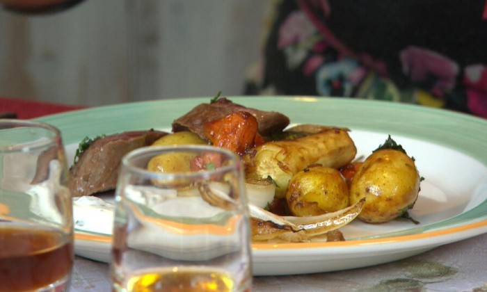 Reerugfilet met geroosterde groenten en theelikeur