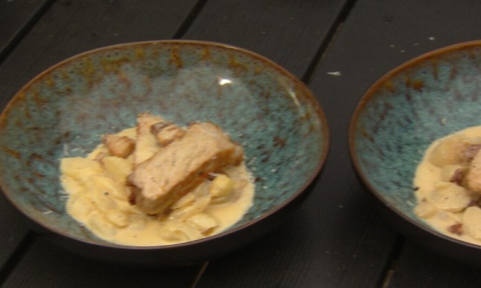 Biefstuk met zoetzure ui, Leuvense paté, amandelen en een biersausje
