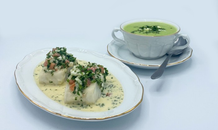 Luxe klassieke erwtensoep en kabeljauw à la Dugléré