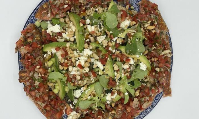 Orzo met gebakken zeewolf, cherrytomaatjes en kruidensalsa