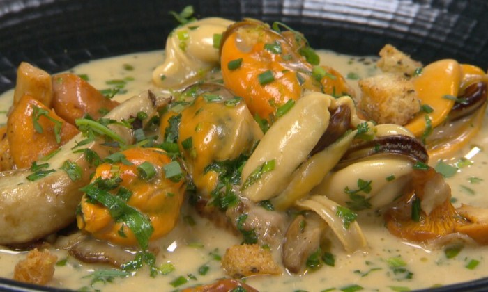 Geglaceerde mosselen met eekhoorntjesbrood en een klassieke botersaus