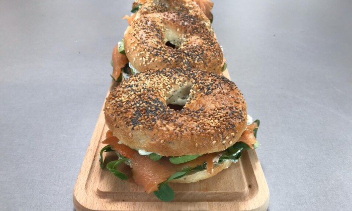 Zelfgemaakte bagels met cream cheese, gerookte zalm en avocado