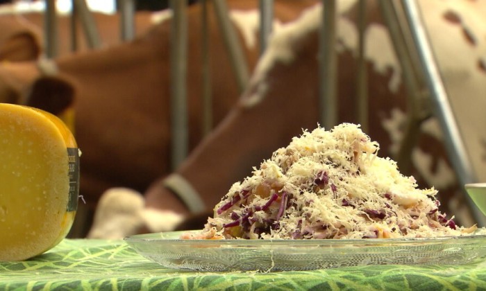 Fris slaatje met geitenyoghurt, zoetzure ui en appel