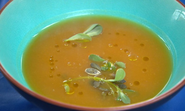 Pompoensoep met curryolie en walnoten
