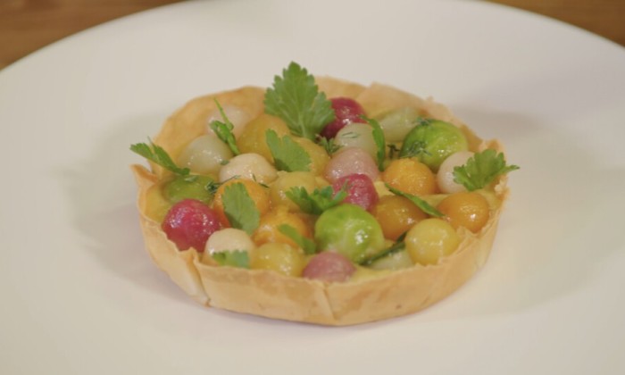Boerenkoolpaté met frisse salade en zoet-zuur van ui en mango