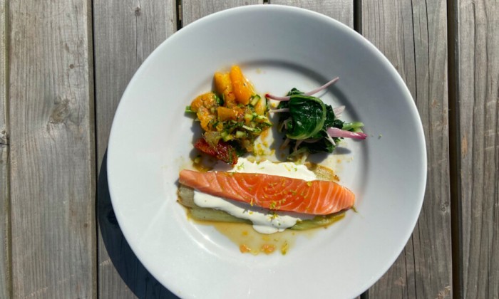Makreelburger met tomatensalsa en gekonfijte ui